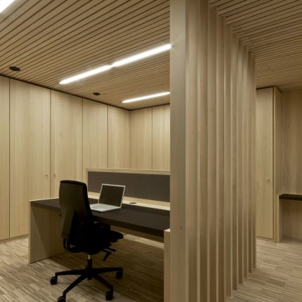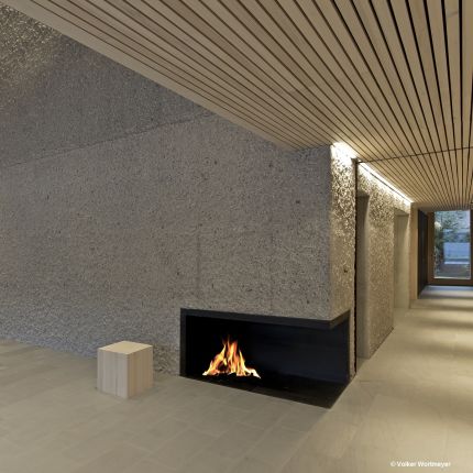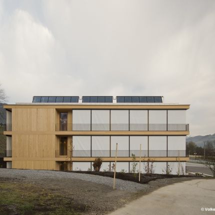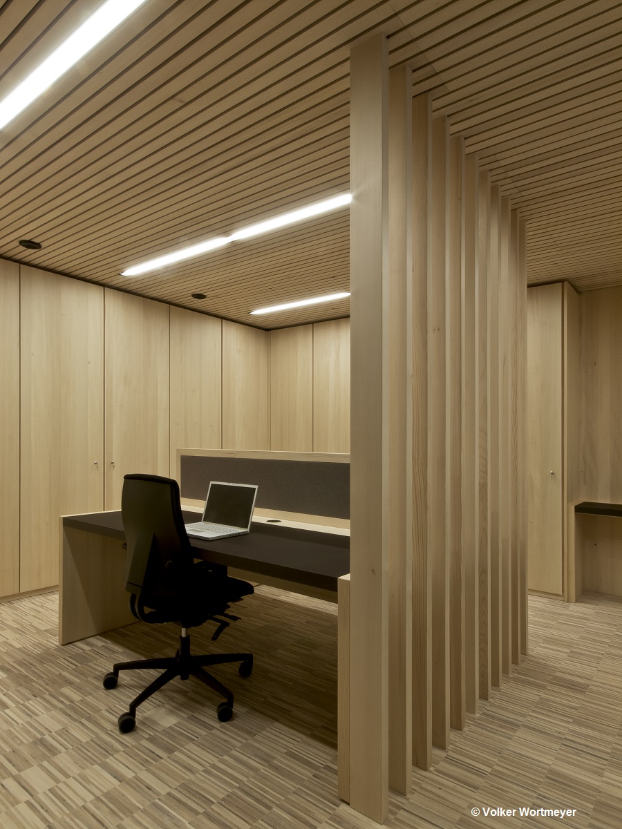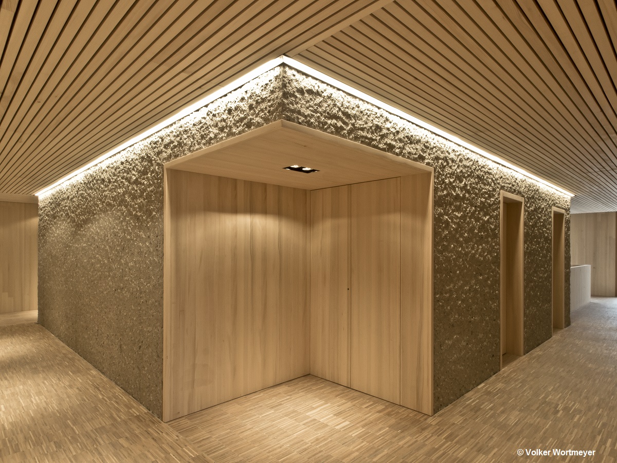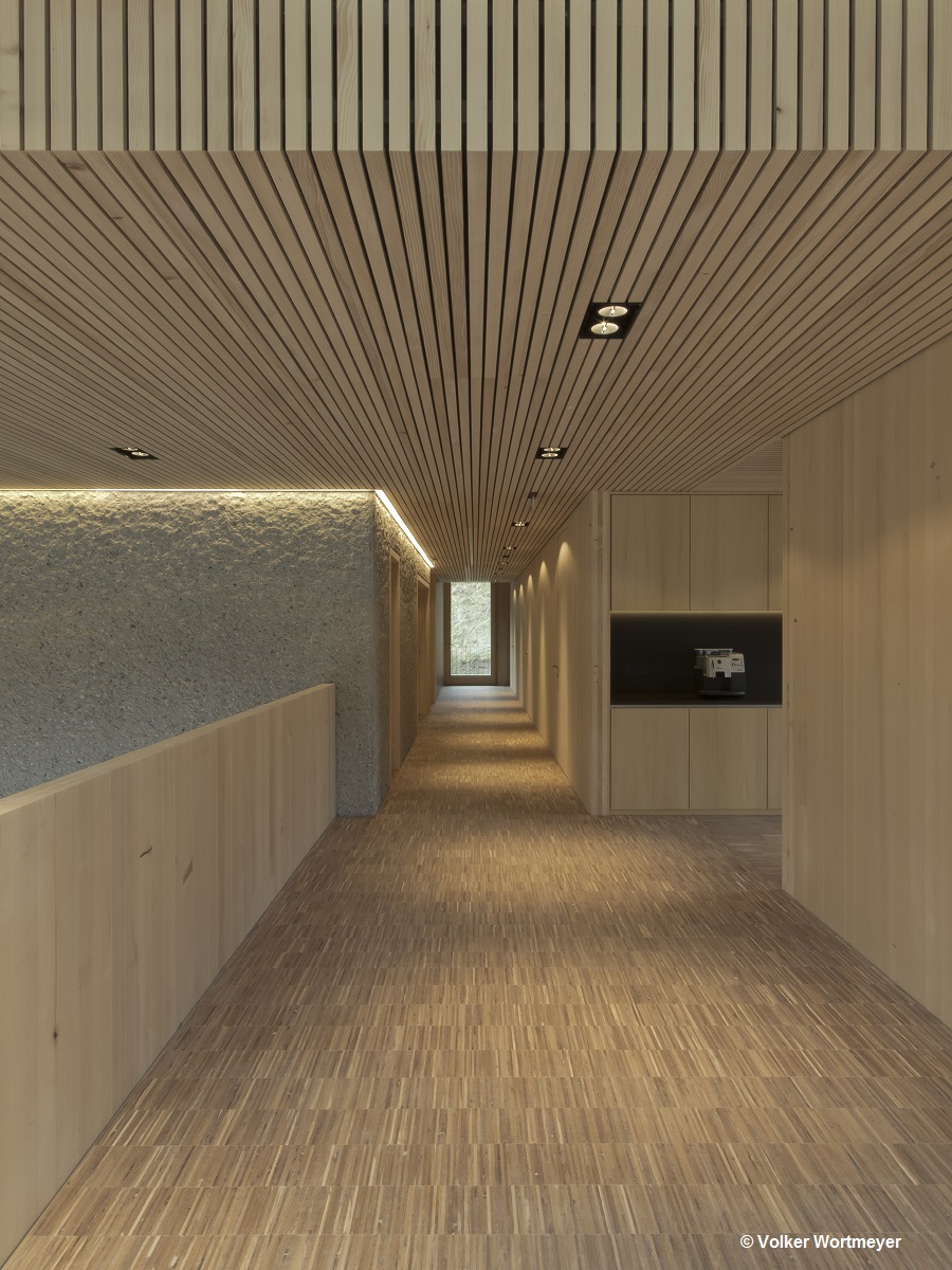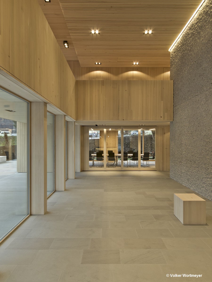 Der Funktionskern wurde aus gespitztem Sichtbeton hergestellt, verkleidet mit einer glatten Holzoberfläche, die eine angenehme Arbeitsatmosphäre verbreitet. Der Einsatz der regionaltypischen Weißtanne bei der Außenfassade und im Innenraum zeigt gestalterisch große Wirkung. Ein sparsamer Umgang mit den regional verfügbaren Ressourcen wird durch das Energiekonzept des Passivhausstandard mit aktiver Raumlüftung, Bauteilaktivierung des Betonkerns und der am Dach montierten Solaranlage sichergestellt.