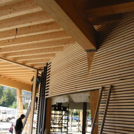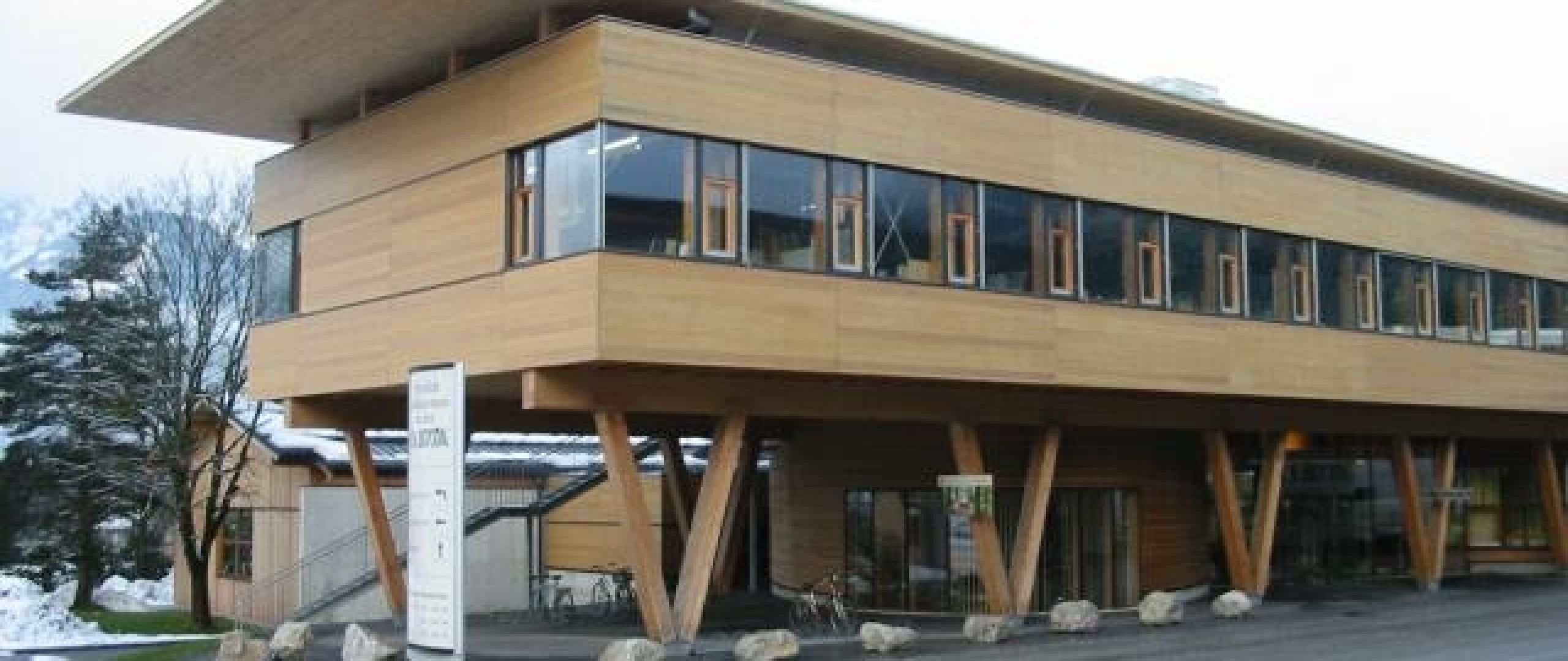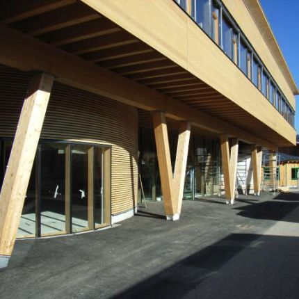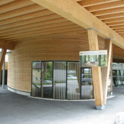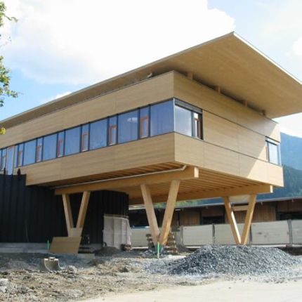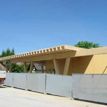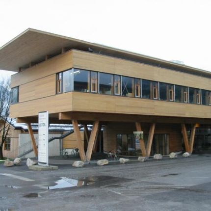 Das Bauvorhaben besteht aus einem Bürogebäude in dem ein Beratungs- und Schulungszentrum integriert ist. Der Büroteil lagert als Holzbox auf V–Stützen aus Brettschichtholz über der öffentlich zugänglichen Erdgeschosszone. Durch ein unterspanntes Dachsystem konnte ein stützenfreier Büroteil von 14 x 43 verwirklicht werden.