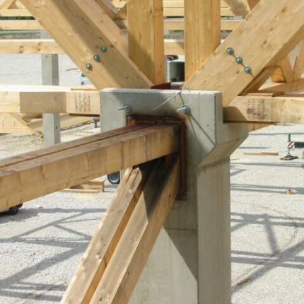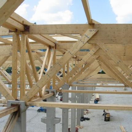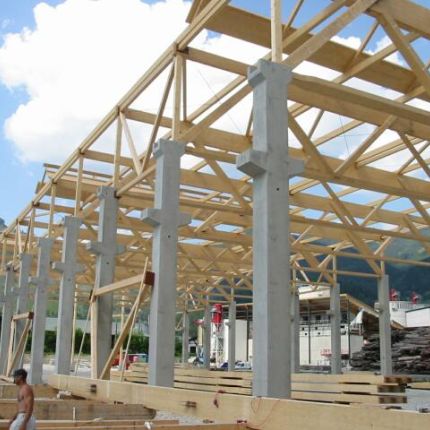 Fachwerkbinder aus Brettschichtholz auf Stahlbetonsäulen,