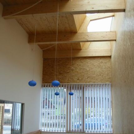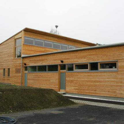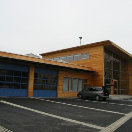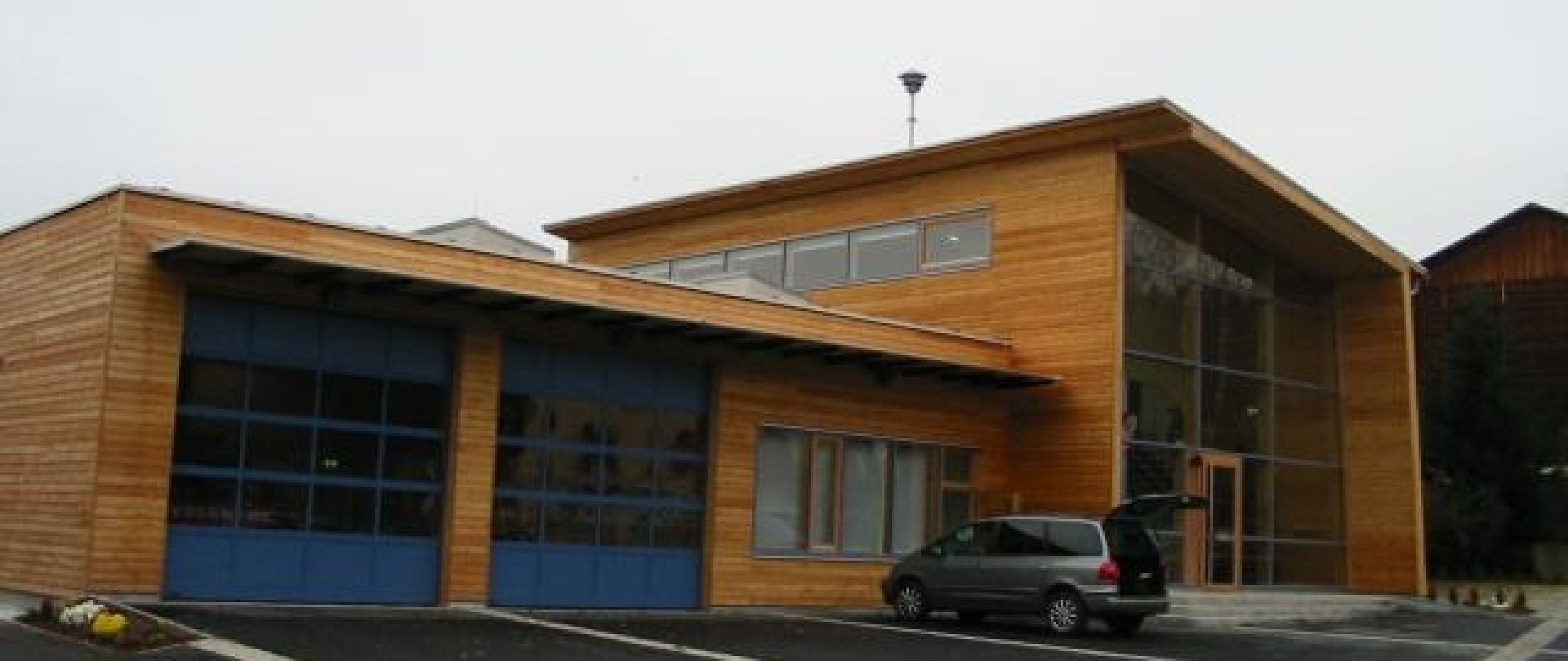 Das Bauvorhaben besteht aus dem Rüsthaus und dem angebauten Gemeindezentrum. Beide Bauteile sind in Holzrahmenbauweise errichtet, Dach- und Deckenkonstruktion besteht aus Brettschichtholzbindern mit verleimten Brettstapeldecken.