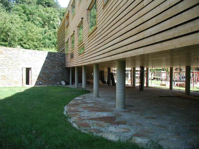 Bauherr: Marktgemeinde Wildon Baujahr: 2003/04 Planung: Nussmüller Architekten, Graz Statik und Konstruktion: DI Josef Koppelhuber Holzbaufirma: Kulmer, Pischelsdorf Generalunternehmer und Baumeister: Strabag, Graz Das Tragwerk des Klassentraktes ist in Mischbauweise aus Holzmassiv- und Holzriegelbau errichtet: Dach- und Deckenkonstruktionen bestehen aus Brettschichtholzdecken, die aussteifenden Innenwände aus Brettsperrholzelementen, und die im Grundriss gebogenen Außenwände sind in Holzriegelbauweise errichtet. Der an den Klassentrakt anschließende eingegrabene Turnsaal wurde in Stahlbetonweise errichtet.