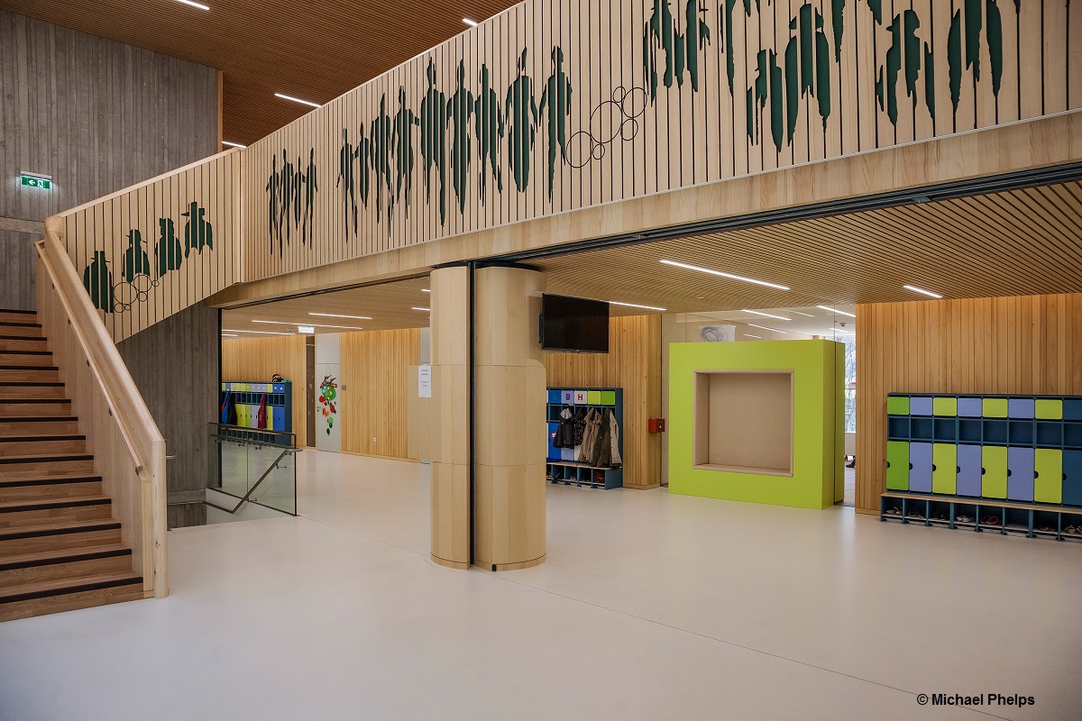 Barrierefreie Zugänge und farblichen Akzente im Inneren sollen den Kindern den Alltag erleichtern. Auch der atemberaubende Ausblick in die umgebende Gebirgswelt von den, mit Holzrosten befestigten, Terrassenflächen machen den Neubau zu einem Ort des Wohlfühlens.