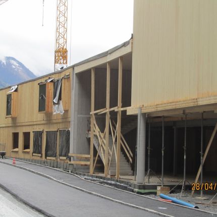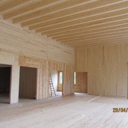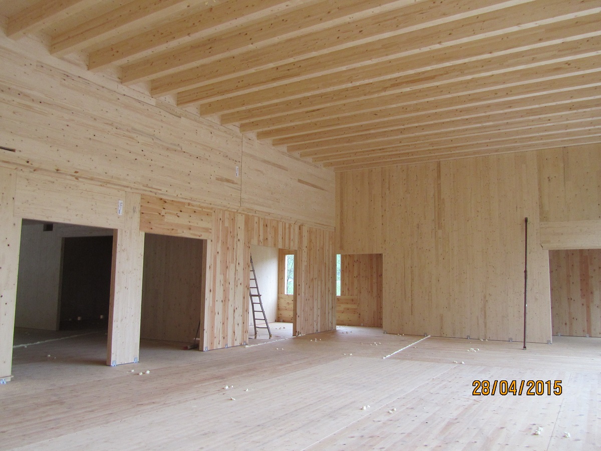 Der zweigeschossige, längliche Baukörper wurde teilweise in Skelettbauweise, im überwiegenden Maße mit vorgefertigten Holzelementwänden und -decken errichtet. Ebenso an den Innenwänden kann man die einmalige Aura des Holzes spüren.